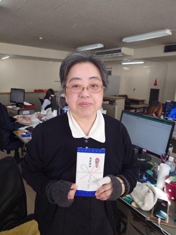 「今回の還暦のお祝いありがとうございました。職場が割と自由がきくので働きやすく勤めさせてもらってます。本当は写真は苦手なのですが、せっかくのお祝いだったので恐縮ですが…