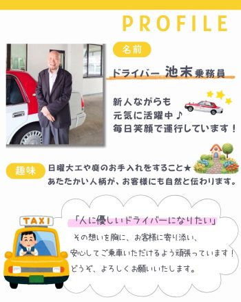 新人ながらも活躍している池末乗務員。写真とインタビューは研修中の時のものです。現在はタクシードライバーデビューし、毎日元気に運行しています。