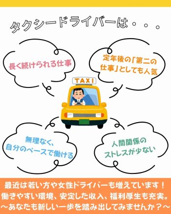 「定年後にまだ収入が欲しいのでタクシードライバーになりました。お客様との対話も楽しいし、逆に必要以上に対話しなくてもいいし、自分にあった働き方ができるところが魅力です。」